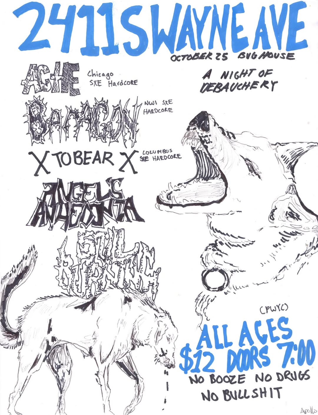 October 25 @ 7:00 pm - 11:00 pm Ache, Baragon, X To Bear X, Angel’s Anhedonia, Still Burning The Bug House All Ages, $12, No Booze, No Drugs