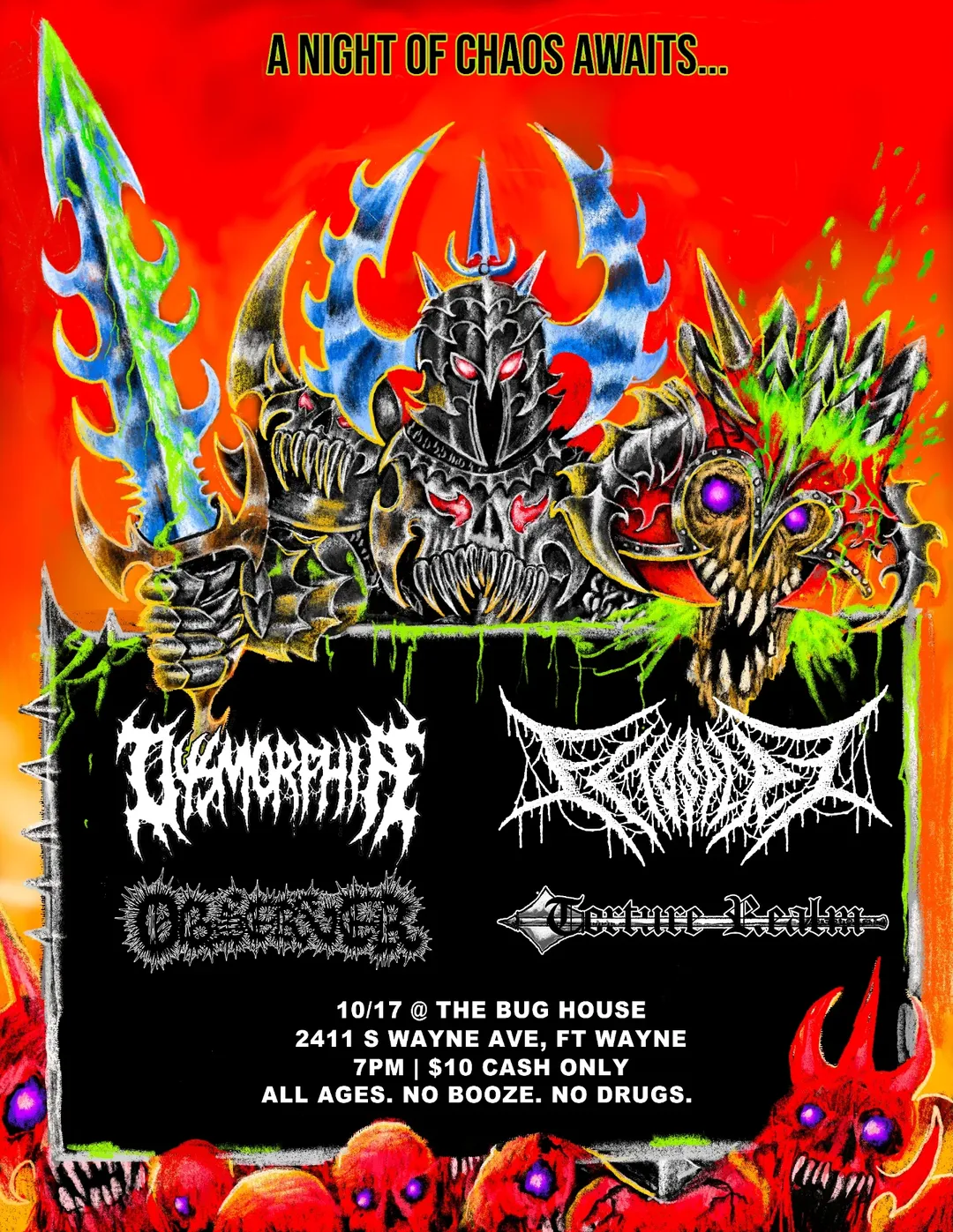 October 17 @ 7:00 pm - 11:00 pm Dysmorphia, Ectospire, Observer, Torture Realm The Bug House 7PM, $10 Cash Only, All Ages, No Booze, No Drugs