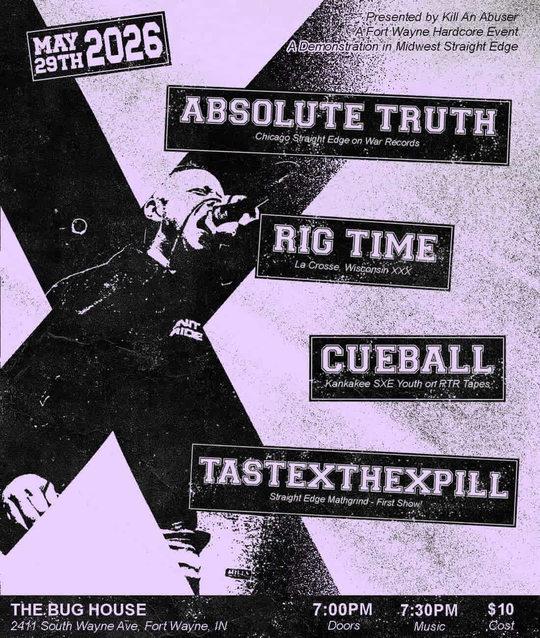 7PM, All Ages, $10 Cash Only, No Booze, No Drugs